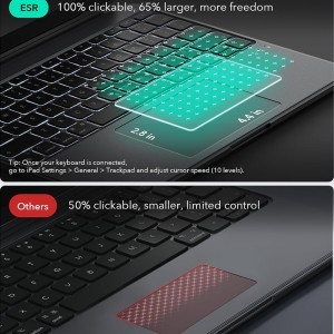 Az ESR Shift Keyboard tok a billentyűzet és az iPad zseniális szétválaszthatóságának köszönhetően maximális rugalmasságot kínál. A vezeték nélküli (Bluetooth) billentyűzet és a nagyméretű, teljesen kattintható trackpad (2.8 x 4.4 hüvelyk, 65%-kal nagyobb másokhoz képest) olyan intuitív és kényelmes gépelési, illetve navigációs élményt nyújt, amely szinte elfeledteti, hogy nem egy MacBook Prón dolgozik. Helyezze az iPadet a szemének megfelelő távolságba, és élvezze a szabadságot, hogy a billentyűzetet akár az ölében, akár egy másik felületen használja. Tökéletes választás azoknak, akik a laptop kényelmét várják el táblagépüktől anélkül, hogy kompromisszumot kötnének a mobilitás terén.