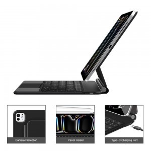 A Tech-Protect SmartCase Mágneses billentyűzettel egy praktikus és modern kiegészítő, amely az iPadet egy funkcionális eszközzé alakítja munkához, tanuláshoz és szórakozáshoz. Az elegáns tok, a mágneses tartó és a vezeték nélküli billentyűzet touchpaddal kombinálva a mindennapi tablet használatot még kényelmesebbé teszi. A mágneses tok biztonságosan tartja az iPadet a megfelelő pozícióban, lehetővé téve, hogy azt ideális szögben lehessen beállítani – legyen szó gépelésről, filmnézésről vagy videohívások lebonyolításáról. A kamera és portok kivágásai lehetővé teszik a készülék teljes funkcionalitását a tok eltávolítása nélkül. A mellékelt háttérvilágítású Bluetooth billentyűzet kényelmes, laptop stílusú billentyűkiosztással és precíz touchpaddal rendelkezik, így képernyő érintése nélkül írhat, böngészhet az interneten és kezelheti az alkalmazásokat. A beépített rendszer gyorsgombok gyorsítják a munkavégzést, és a billentyűzet könnyen csatlakoztatható és használható.