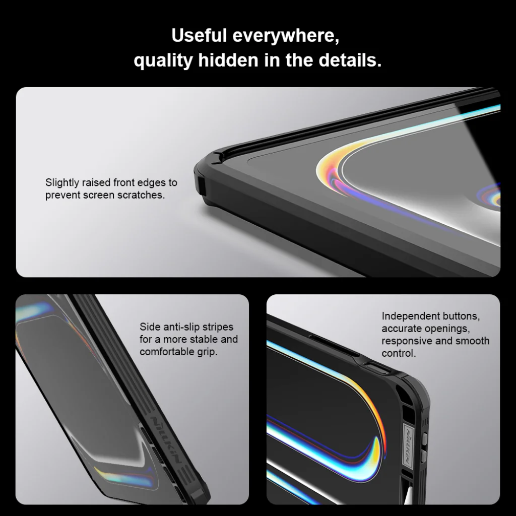 Az olyan részletek, mint az enyhén kiemelt élek a képernyő karcolódásának elkerülése érdekében, az oldalakon csúszásgátló csíkok a jobb fogás érdekében és az érzékeny, precíz gombok, ideális védelmet biztosítanak a táblagép számára, amely így bármilyen helyzetet képes kezelni.