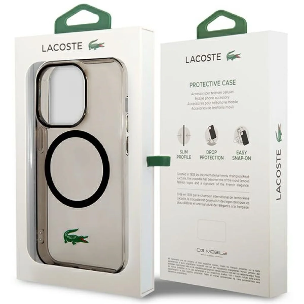A Lacoste legújabb védőtok kollekcióját minimalista dizájnt és magas funkcionalitást kedvelők számára tervezték. A kollekció csúcsminőségű kidolgozottságot és divatos, stílusos megjelenést kínál. Az átlátszó MagSafe kollekció azoknak készült, akik egyedi tokot keresnek iPhone készülékük védelmére. A tok IMD (In-Mould Decoration) technológiát alkalmaz. A grafikák meleg dombornyomással készülnek, majd egy finom TPU réteggel vannak bevonva, amely ellenállóvá teszi őket a kopással szemben. A tok hátoldala áttetsző polikarbonátból készült, míg a szélei rugalmas poliuretánból, ami megkönnyíti a felszerelést. Az átlátszó MagSafe védőtokokat mágnesgyűrű díszíti, amely lehetővé teszi a könnyű és gyors töltést. A gyűrű színben passzol a tokkal, így figyelemfelkeltő megjelenést kölcsönöz neki. A mágnesgyűrű teljes mértékben kompatibilis a MagSafe töltőkkel, biztosítva a mágneses töltési képességeket. A stílusos védőtok célja a készülék védelme, miközben divatos megjelenést is kölcsönöz. Pontos illeszkedése biztosítja a smartphonék védelmét a karcolások és ütődések ellen. A világszerte elismert krokodil embléma megerősíti az eredetiséget és a kiváló minőséget. A terméket a Lacoste márka licencével gyártották.