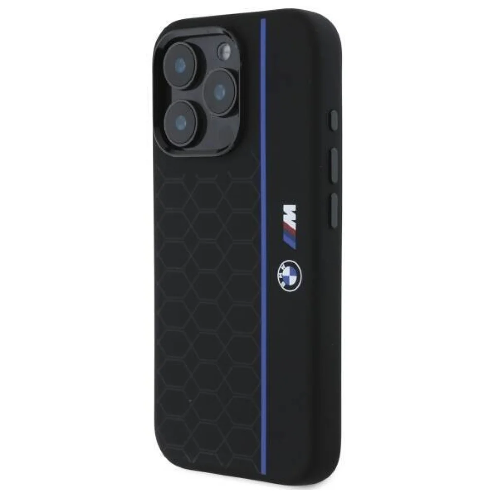 iPhone 16 Pro Max fekete Original BMW Hexagon Kék Csíkos Szilikon Magsafe Tok