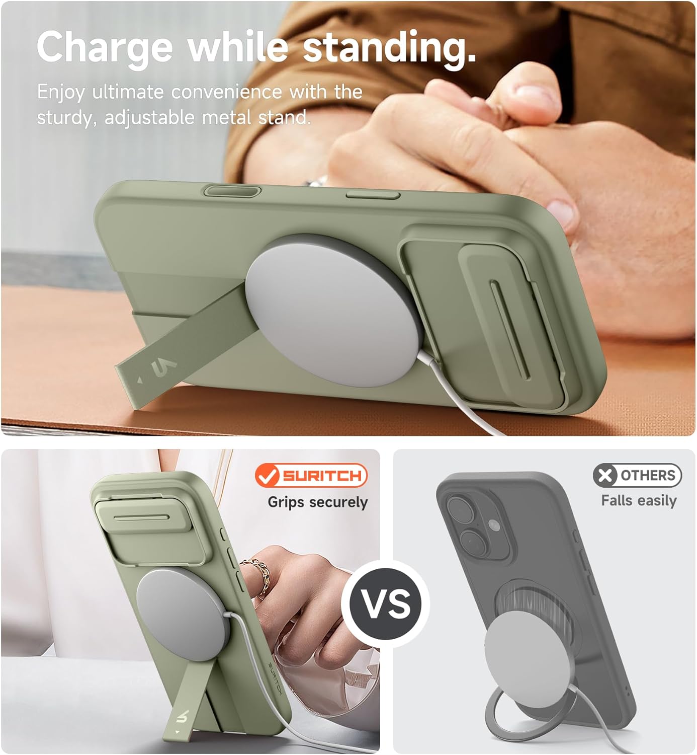 Élvezze a páratlan kényelmet a masszív, állítható fém állvánnyal. Akár videókat nézne, online megbeszélésen venne részt, vagy akár töltés közben szeretné használni a telefont, az állvány biztosítja a stabil és ideális betekintési szöget. Más tokokkal ellentétben a Suritch állványa biztosan tartja a telefont, így nem kell aggódnia, hogy az könnyen felborul, és lehetővé teszi a kényelmes töltést is álló helyzetben.