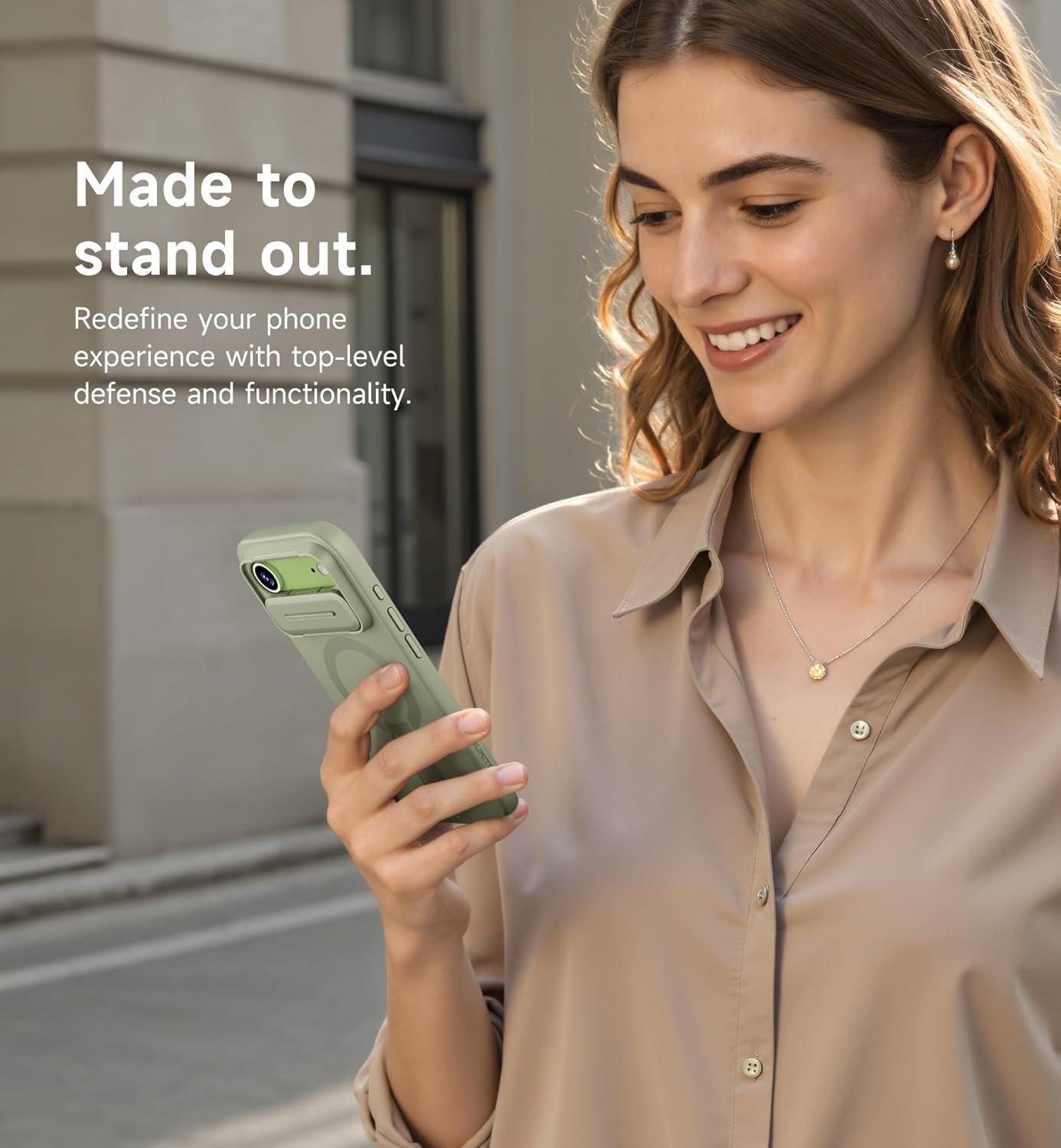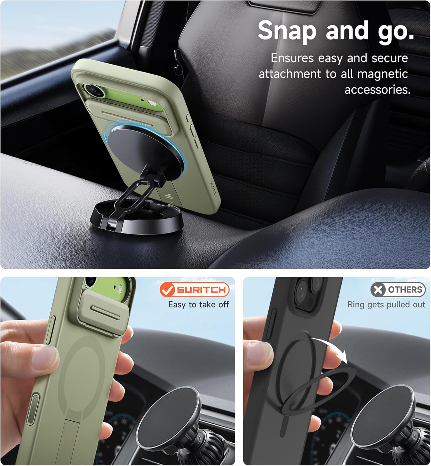 Védje iPhone 17 Air készülékét a Suritch prémium minőségű tokjával, amely a legmagasabb szintű védelmet nyújtja anélkül, hogy kompromisszumot kötne a funkcionalitásban és a stílusban. Ez a gyönyörű zöld tok nem csupán ütésálló, hanem innovatív MagSafe kompatibilitással, precíz kameravédővel és praktikus, kihajtható állvánnyal is rendelkezik, hogy minden helyzetben kényelmesen használhassa telefonját.