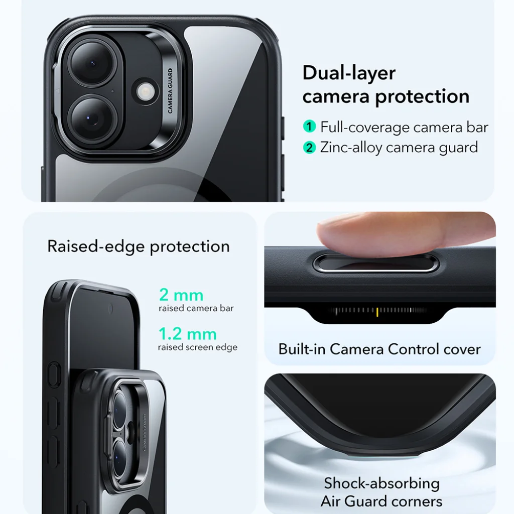- Ütéscsillapító Air Guard sarkok: A sarkokban található légpárnás technológia hatékonyan elnyeli az ütéseket, extra védelmet nyújtva a legérzékenyebb pontokon.