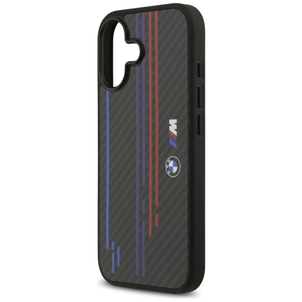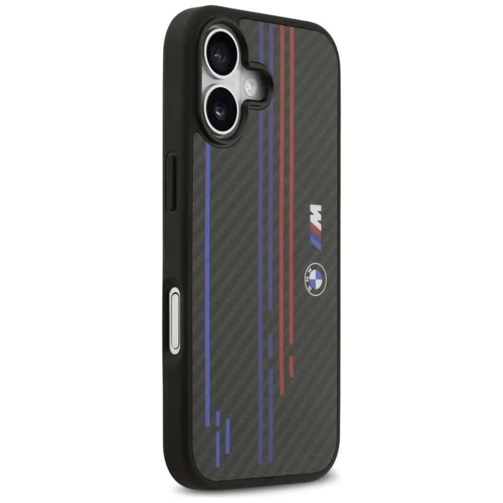 A BMW M Kevlar Vonalak és Logó MagSafe tok ötvözi a sportos karaktert a maximális tartóssággal. Az aramid szálból készült felület jellegzetes karbonszerű megjelenést és ellenállást biztosít a mindennapos használattal szemben. A dizájn az ikonikus BMW M csíkozással és BMW logóval van díszítve, hangsúlyozva a termék presztízsét és hitelességét. A kamera kerete és a gombok fekete színűek, kiegészítve a tok elegáns és harmonikus megjelenését. A karcsú profil és a gondos kidolgozás modern és stílusos megjelenést kölcsönöz a toknak.