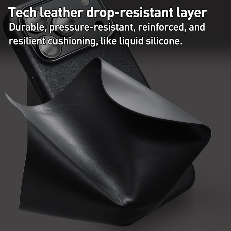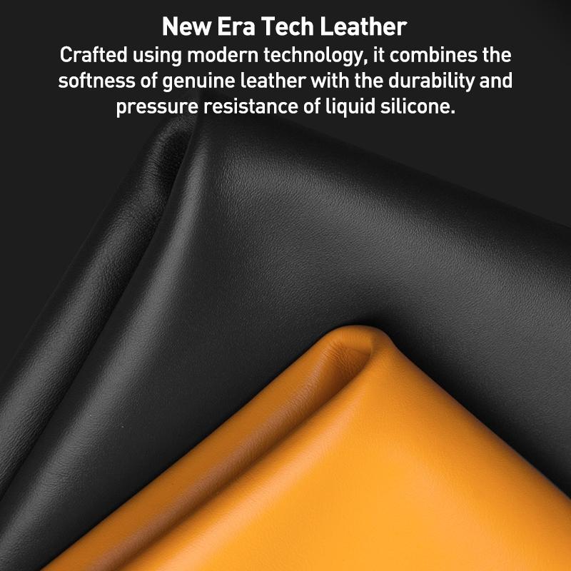 A "New Era Tech Leather" anyag a valódi bőr puhaságát és prémium tapintását ötvözi a folyékony szilikon tartósságával és nyomásállóságával. Ennek köszönhetően a tok rendkívül strapabíró, ütésálló, megerősített és rugalmas párnázást biztosít, miközben rendkívül vékony és könnyű marad. A kényelmes fogás mellett az anyag ellenáll az ujjlenyomatoknak, így mindig friss és tiszta marad a készülék.