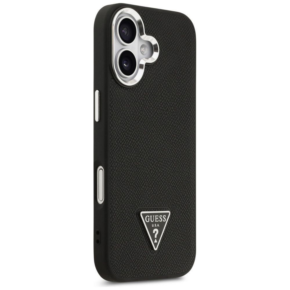 A tok hátlapján található jellegzetes, finoman erezett (grained) textúra luxus érzetet kelt, miközben kiváló fogást biztosít, minimalizálva a kicsúszás esélyét. Az alsó részén elhelyezkedő, ezüst színű, fém Guess logó – a márkára jellemző háromszög alakzatban, a "GUESS U.S.A." felirattal és ikonikus kérdőjellel – azonnal felismerhetővé teszi a prémium minőséget és a divatos megjelenést. A kamera modul körüli ezüst keret és a szintén ezüst színű, precízen illeszkedő gombok tovább fokozzák a tok exkluzív esztétikáját, harmonikus egységet alkotva a logóval. A tok vékony profilja (Slim Profile) nem növeli feleslegesen az iPhone 17 méretét, megőrizve annak eredeti, karcsú vonalait.