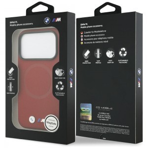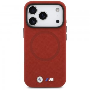 A tok prémium minőségű, finoman texturált piros felülete azonnal magára vonzza a tekinteteket, és utánozhatatlanul sportos, mégis elegáns megjelenést kölcsönöz. Az anyag kellemes tapintású és egyedi textúrája kiemeli az iPhone 17 Pro kifinomultságát, miközben biztos fogást garantál. A hátlapon elegánsan, dombornyomott fém kivitelben helyezkedik el a klasszikus BMW embléma és a sportos M logó, amelyek a precíz kidolgozottságot és a márka iránti elkötelezettséget sugározzák.