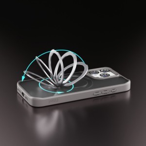 Kétféle anyagból készült: puha TPU és kemény PC. A 2,5 mm vastagság az ideális kompromisszum a vékony és a védelem biztosítása között. A megemelt szélek további védelmet nyújtanak a képernyőnek a sérülés ellen. Egy diszkrét, dombornyomott logó található a tok oldalán, amely stílusos és minimalista jelleget kölcsönöz a teljes tervezésnek. A 2700 GS erősségű beépített mágnesekkel ellátott fém tartó kényelmes állványként szolgál filmek nézéséhez vagy videohívások lebonyolításához, és biztonságosabb fogást is biztosít a telefon használatakor. A fogaskerék mechanizmus egy diszkrét, kellemes hangot ad minden mozdulathoz.