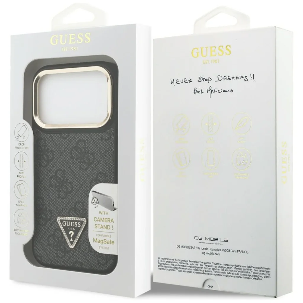 A Guess 4G PU Triangle Logo & Állványos Kamera MagSafe egy exkluzív védőtok-sorozat, amely kivételes funkcionalitást ötvöz stílusos, egyedi dizájnnal. Ezeket a tokokat azok számára tervezték, akik értékelik telefonjuk biztonságát, valamint annak elegáns megjelenését. Ideális választás azoknak az eszköztulajdonosoknak, akik a MagSafe technológiát használják.