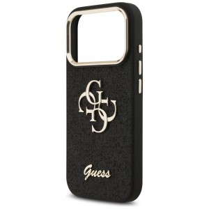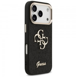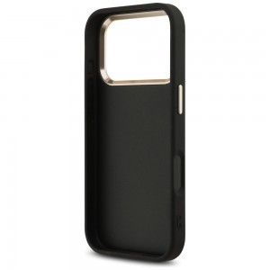 A tok fekete, finoman textúrált felülettel rendelkezik, amely luxus érzetet és kiváló fogást biztosít, emellett ellenálló a mindennapi kopással szemben. A központi eleme a fényes, arany színű Guess 4G logó, amely azonnal felismerhetővé teszi a márkát és elegáns megjelenést kölcsönöz. Ezt egészíti ki az alsó részen található elegáns Guess felirat, szintén arany árnyalatban, tovább fokozva a luxus érzetet. A kamera modul körüli ragyogó arany fém keret nemcsak extra védelmet nyújt a lencséknek, hanem exkluzív megjelenést kölcsönöz a telefonnak. Az arany színű, érzékeny gombok tökéletesen illeszkednek a tok összképébe, harmóniában a Guess ikonikus esztétikájával.