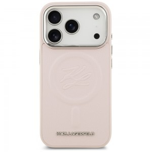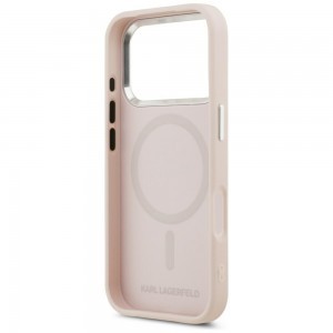 A tok kiváló minőségű, kellemes tapintású, finoman texturált anyagból készült, amely luxus érzetet kölcsönöz. A hátoldalon elegánsan dombornyomott "KL" monogram, a Karl Lagerfeld kezdeményezés diszkrét jele található, amely egyben a MagSafe technológia pontos elhelyezkedését is jelzi. Alatta egy fényes, fém "KARL LAGERFELD" logó emeli ki a márka prémium mivoltát, amely elegáns kontrasztot alkot a rózsaszín felülettel.