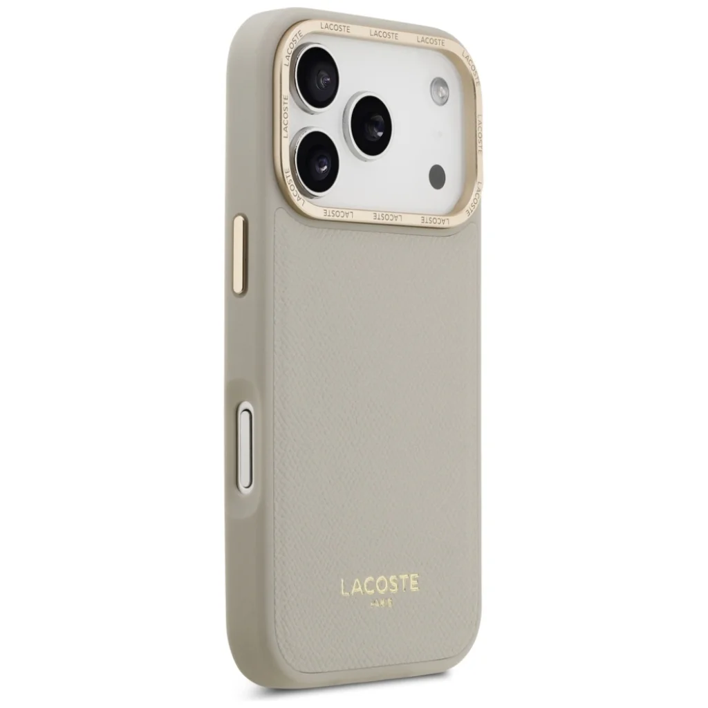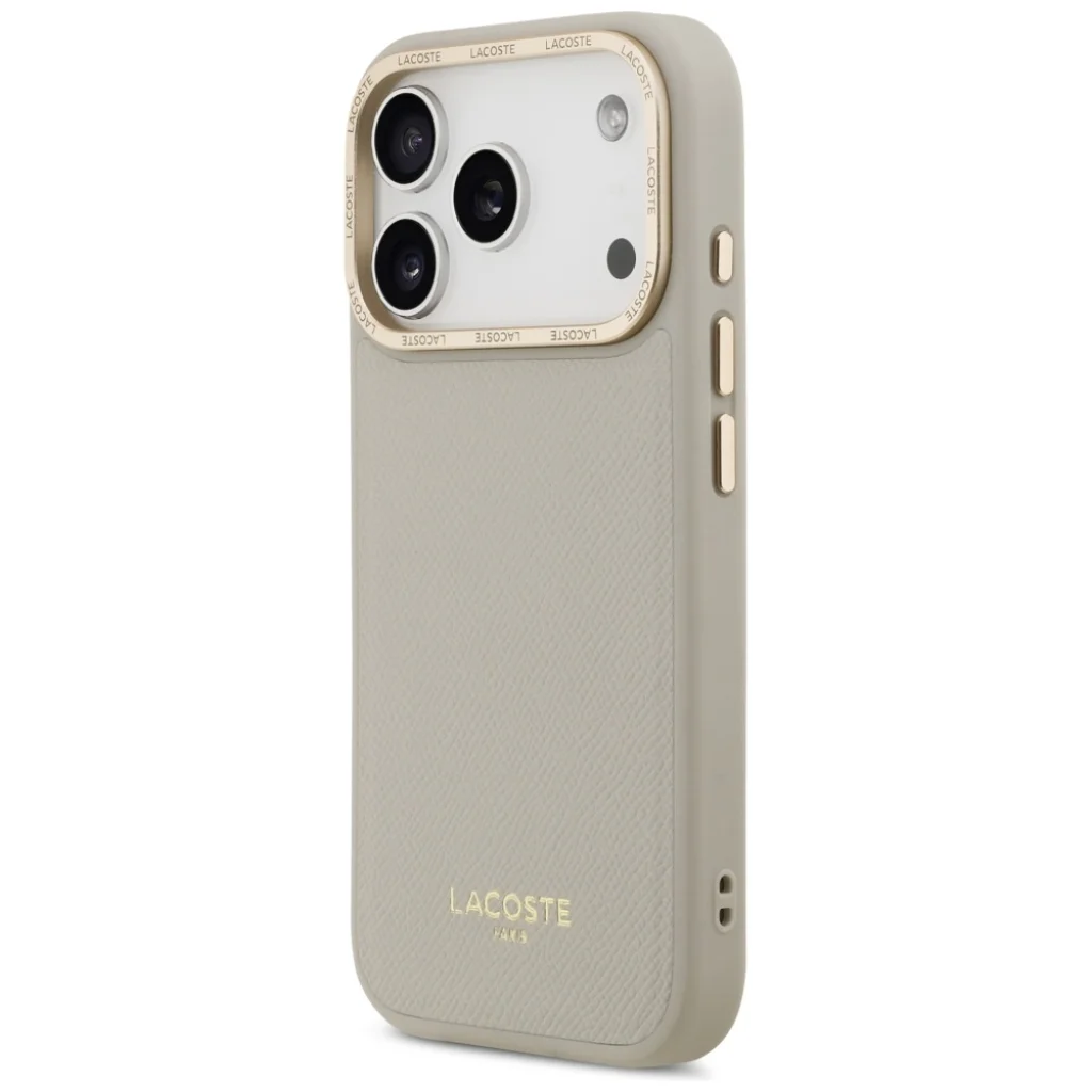 Stílusos megjelenés: A tok kiváló minőségű ökobőrrel van borítva, érdekes textúrával. Emellett az arany LACOSTE felirattal és a kamera körüli arany kerettel van díszítve.