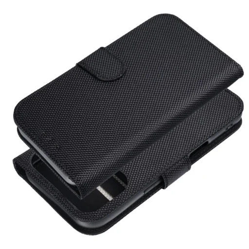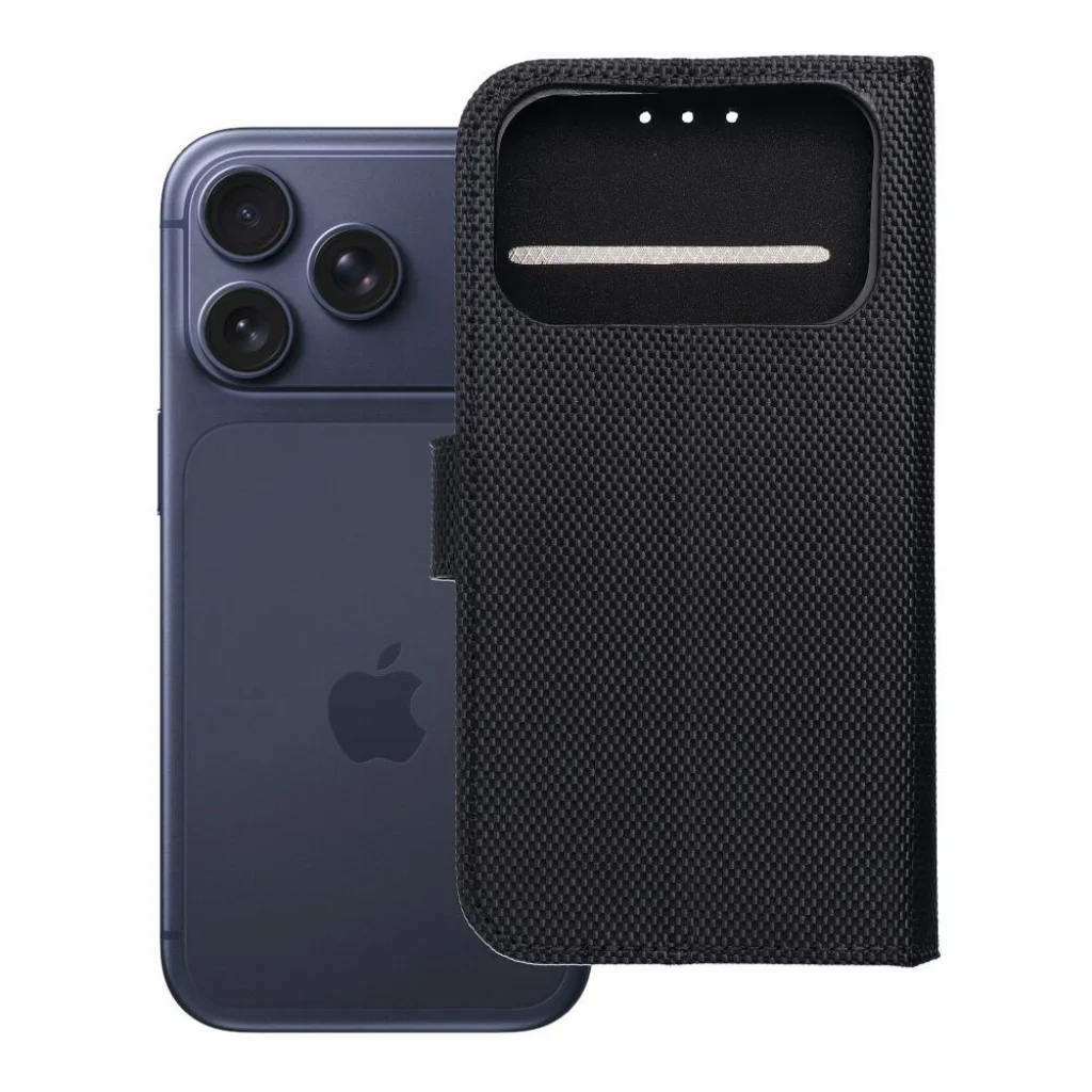 iPhone 17 Pro lopásgátló 4 kártyás RFID könyvtok fekete tech szövet tok
