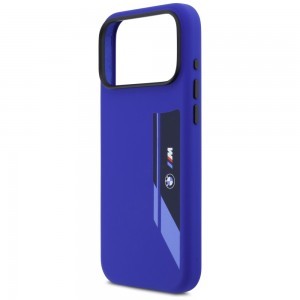 A BMW M Szilikon Függőleges Logó MagSafe tok magas minőségű folyékony szilikonból készült, amely sima textúrájáról és kellemes tapintású felületéről ismert. Kiemelkedő jellemzője a sötétkék és kék árnyalatú függőleges geometriai csík, amely a BMW M sportos esztétikáját idézi. A tok felületét a BMW logó és az M embléma díszíti, kiemelve dinamikus és elegáns karakterét. A tok tartalmaz egy fekete kamera keretet és integrált gombfedőket, melyek extra védelmet és egységes megjelenést biztosítanak.