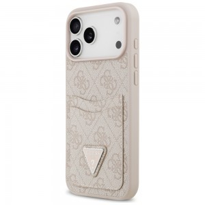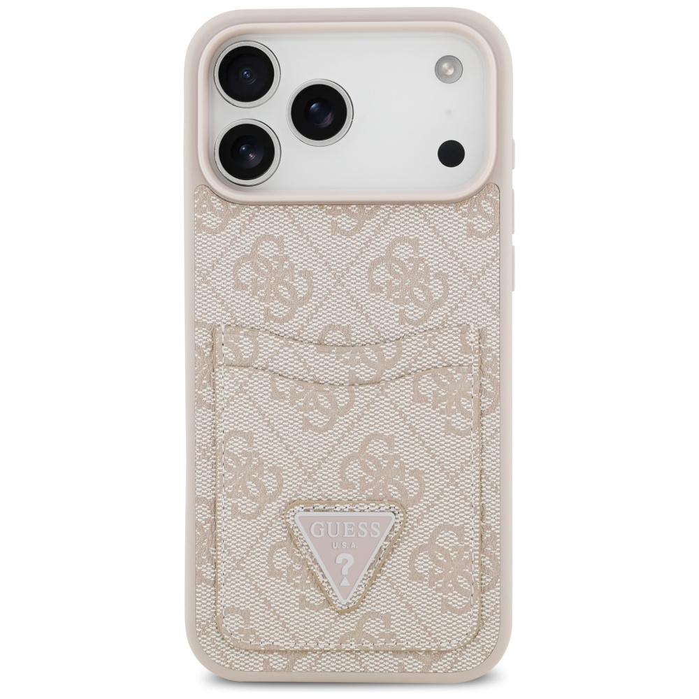 - Ikonikus Guess stílus: A tok hátulját a klasszikus 4G monogramos mintázatú, környezetbarát öko-bőr borítja, amely kifinomult megjelenést kölcsönöz. A tok alján található, diszkréten dombornyomott háromszög alakú Guess logó embléma magabiztosan hirdeti a márka presztízsét és a kollekció egyediségét.