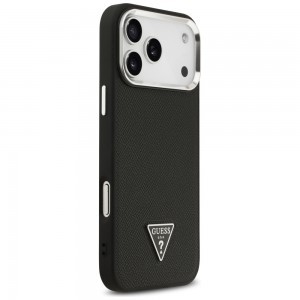 A tok lenyűgöző fekete színben, jellegzetes textúrált (grained) felülettel készült, mely nemcsak exkluzív tapintást biztosít, hanem a modern elegancia érzését is sugározza. A hátlapot a Guess ikonikus, fényes ezüstszínű háromszög logója díszíti, amely azonnal felismerhetővé teszi a márkát és kifinomult stílust kölcsönöz a készüléknek. A kamera körüli elegáns ezüst keret és a fémhatású oldalsó gombok tovább fokozzák a tok prémium megjelenését, miközben harmonikus egységet alkotnak.