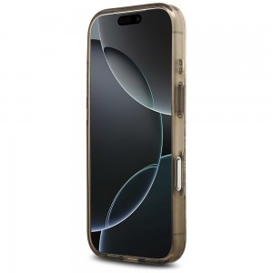 A tok átlátszó alapjára festett, gyönyörű, pasztell árnyalatú virágmintázat – levelekkel és finom barna tónusokkal – azonnal magával ragadja a tekintetet. A design középpontjában egy elegáns, barna kör alakú MagSafe gyűrű található, arany színű "GUESS EST. 1981" felirattal, amely nemcsak a márka örökségét hangsúlyozza, hanem biztosítja a MagSafe tartozékok hibátlan csatlakozását is. A tok szélei áttetsző, füstös barna árnyalatban pompáznak, harmonikusan kiegészítve a virágmintát.