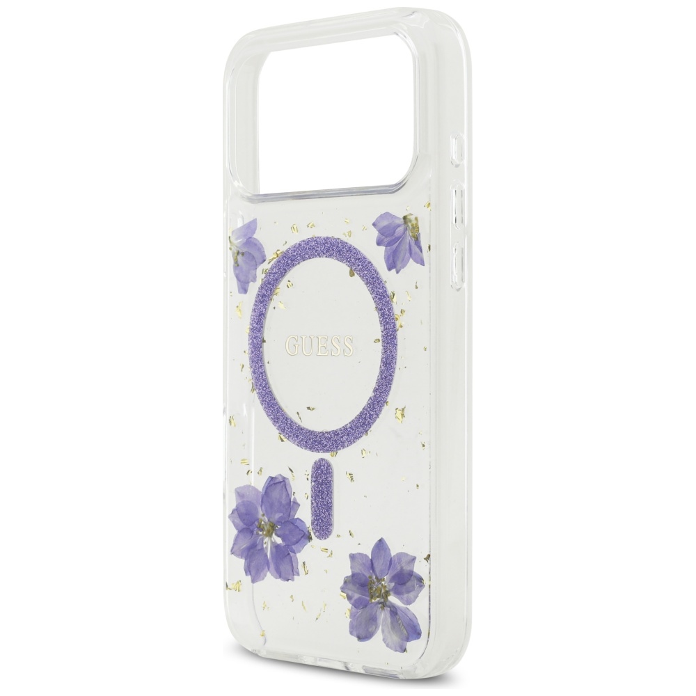 Guess Resin Flowers és Glitter MagSafe tok iPhone 17 Pro Max-hoz – Lila