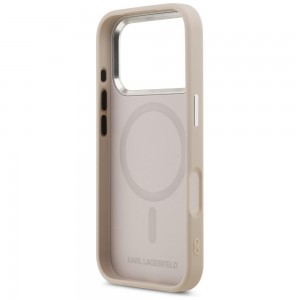 - Diszkrét márkajelzés: A MagSafe gyűrű körül elegánsan dombornyomott "KARL LAGERFELD" felirat hitelesen jelzi a márka magas minőségét és exkluzivitását.