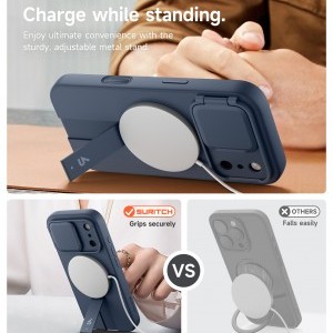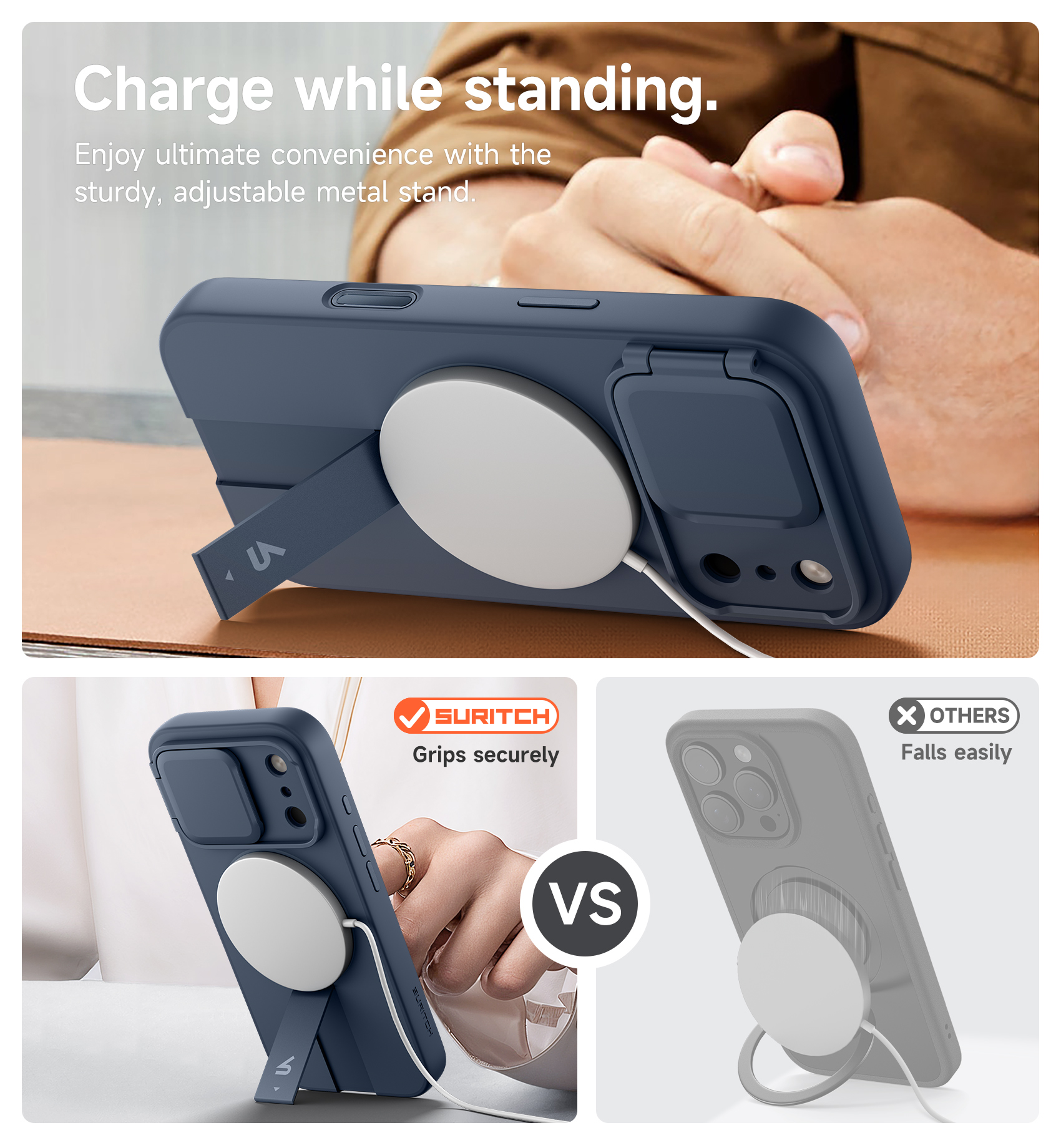 Tapasztalja meg a kivételes kényelmet a stabil és állítható fém állvány segítségével. Akár videókat nézne, akár videóhívást folytatna, vagy egyszerűen csak töltés közben szeretné függőlegesen tartani telefonját, az állvány biztonságos és stabil tartást biztosít. Élvezze a telefonja szabad kezes használatát, anélkül, hogy az elbillenne vagy leesne – a Suritch stabilan tartja a készüléket.