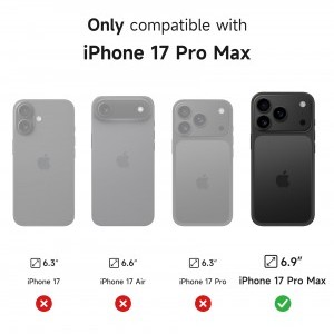 Ez a Suritch tok kizárólag az iPhone 17 Pro Max (6.9 hüvelykes) modellhez készült, garantálva a tökéletes illeszkedést és a problémamentes hozzáférést minden porthoz és gombhoz. Kérjük, győződjön meg róla, hogy a megfelelő készülékhez választja a tokot, mivel más iPhone 17 modellekkel (pl. iPhone 17, iPhone 17 Air, iPhone 17 Pro) nem kompatibilis.