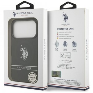 A tok hátlapját a márka ikonikus, fehér/ezüst színű lovaspólós logója díszíti, amely azonnal felismerhetővé teszi a prémium minőséget és a klasszikus sportos eleganciát. A logó alatt található „U.S. POLO ASSN.” felirat két elegáns vízszintes csíkkal keretezve tovább erősíti a tok exkluzív karakterét. A mélyfekete, fényes hátlapot enyhén áttetsző, füstös szürke TPU oldalak egészítik ki, amelyek modern megjelenést kölcsönöznek, és kiválóan illeszkednek a készülék formájához, miközben kiemelik annak eleganciáját.