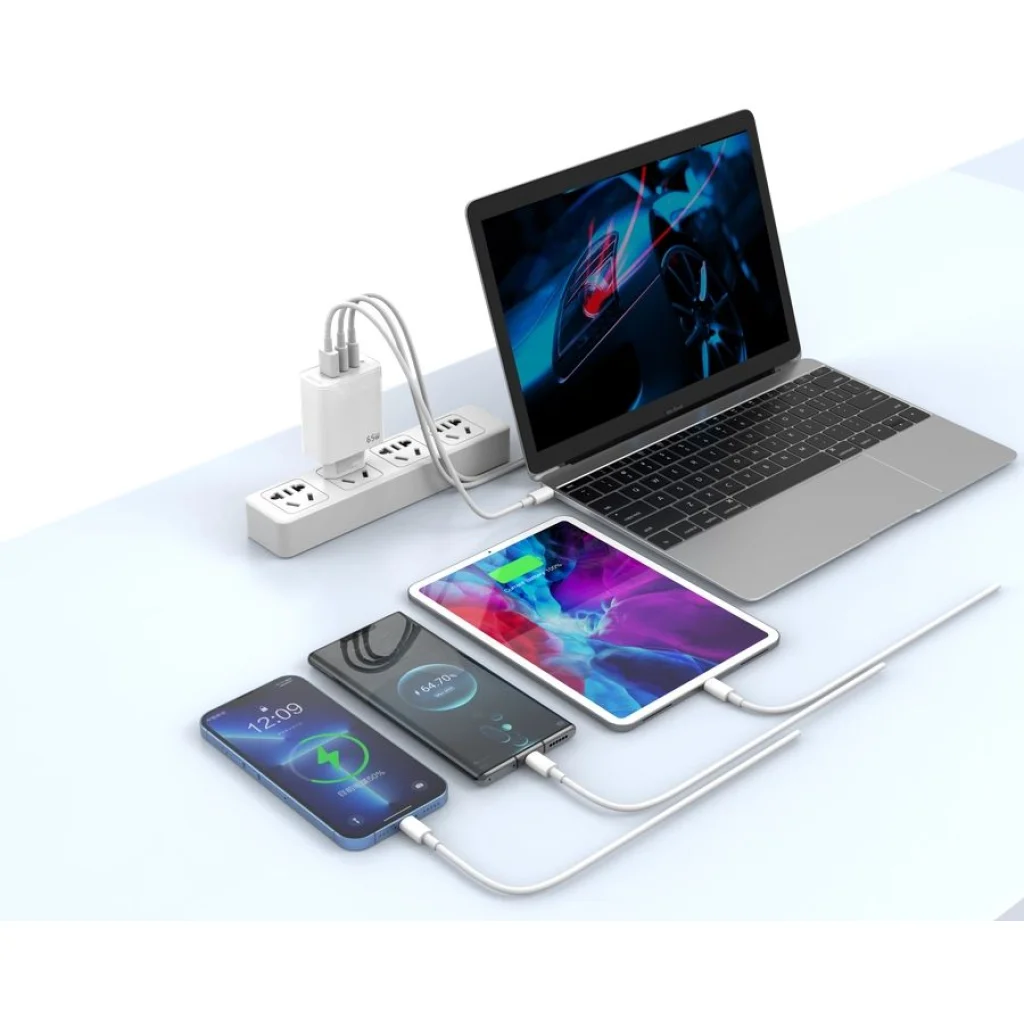 A töltő két USB-C portja és egy USB-A portja intelligensen osztja el a rendelkezésre álló energiát. Az USB-C portok Power Delivery (PD) támogatással rendelkeznek akár 65W-ig egyetlen port használatakor, míg az USB-A port Quick Charge 3.0 (QC3.0) technológiával 30W-ig képes tölteni. Így nem kell kompromisszumot kötnie a sebesség terén, még akkor sem, ha több eszközt tölt egyszerre.