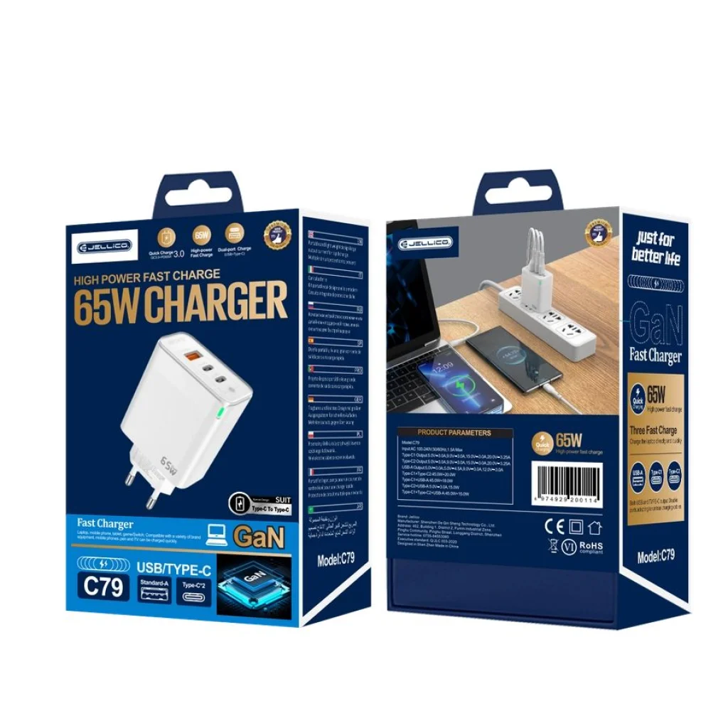 Fedezze fel a JELLICO C79 GaN fali töltőt, a tökéletes megoldást minden eszközének gyors és hatékony töltésére! Ez a kompakt, mégis erőteljes 65W-os töltő a legmodernebb GaN (gallium-nitrid) technológiával készült, ami kisebb méretet, jobb hatékonyságot és alacsonyabb hőtermelést biztosít.