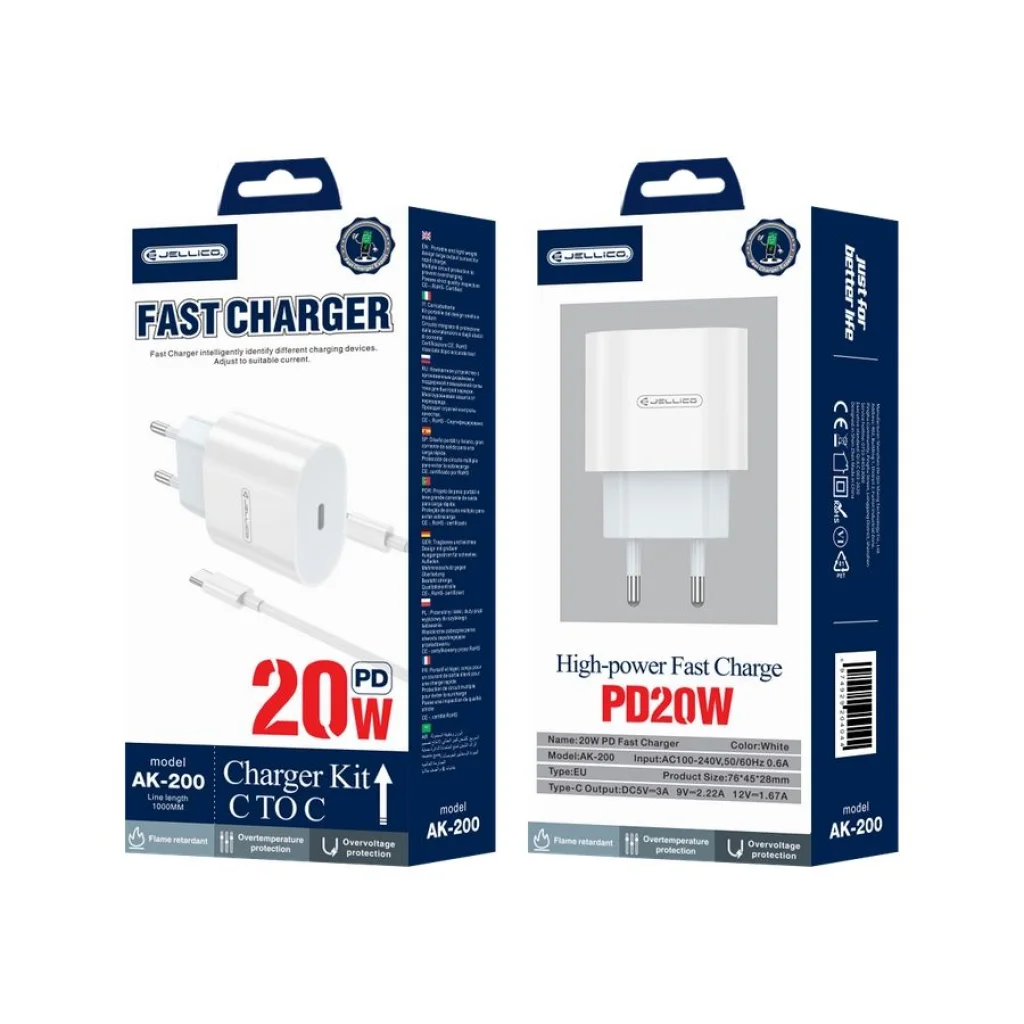 A Jellico AK200 hálózati töltő készlet ideális választás mindazok számára, akik gyors és biztonságos töltési megoldást keresnek modern eszközeikhez. A 20W Power Delivery (PD) technológiának köszönhetően pillanatok alatt feltöltheted okostelefonodat, tabletedet vagy egyéb USB-C kompatibilis készülékedet. A csomagban található 1 méteres, kiváló minőségű USB-C - USB-C kábel azonnali használatot tesz lehetővé, így nem kell külön kiegészítőket beszerezned.