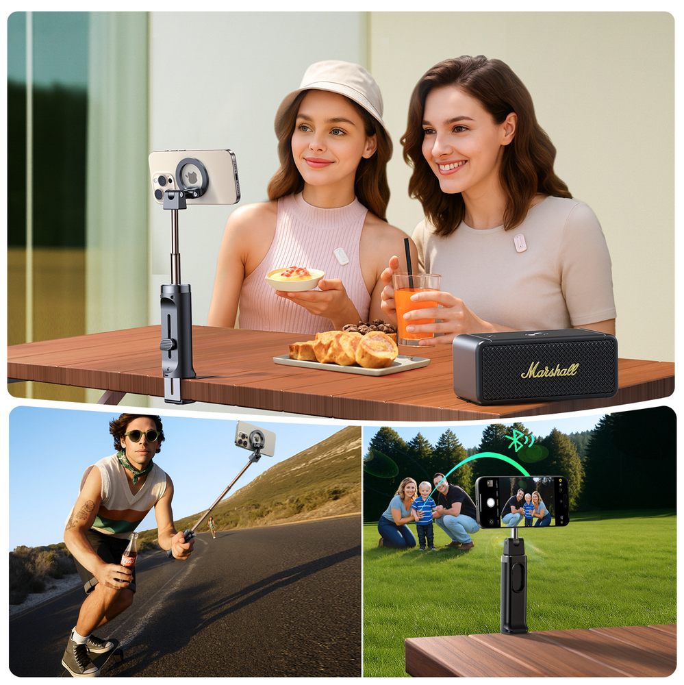 - Három funkció egy eszközben: szelfibotként, állványként és mágneses tartóként is funkcionál, lehetővé téve a fényképezést és felvételek készítését bármilyen pozícióban.