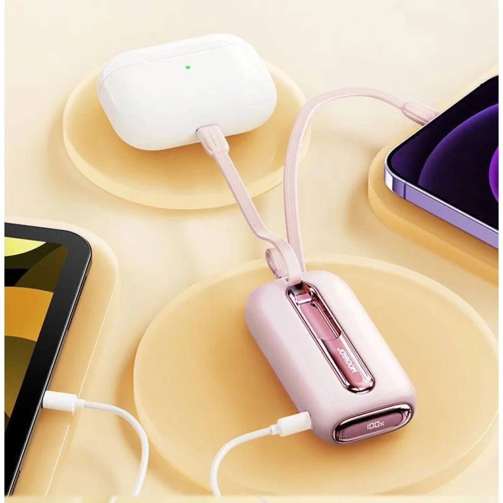 A 10000mAh kapacitású és akár 22.5 W teljesítményű powerbank két beépített kábellel (USB C, Lightning) a Joyroom Színes Sorozatából - JR-L012 rózsaszín verzió. Készen állsz utazásra? Ne felejtsd el a 10000mAh Joyroom Colorful Series JR-L012 powerbankot! Ez a tökéletes kiegészítő, ami készen áll bármilyen utazásra. Így nem kell aggódnod a telefon töltőenergiájáért vagy a töltőkábelekért. Ez a powerbank 10000 mAh kapacitással, egy USB C porttal és két beépített kábellel rendelkezik: USB C és Lightning. Lehetővé teszi akár három eszköz egyidejű töltését kényelmes időpontban, és a 22.5 W-ig terjedő teljesítmény sokkal gyorsabb energiaellátást biztosít. A Joyroom JR-L012 powerbank teste beépített kijelzővel rendelkezik, amely megmutatja, mennyi energia maradt a powerbankban. Könnyű, vékony és kompakt kialakítású. A kompatibilitás miatt sem kell aggódnod. Használhatod a telefonod, okosórád, fejhallgatód vagy karpántod töltésére - függetlenül attól, milyen rendszeren fut.