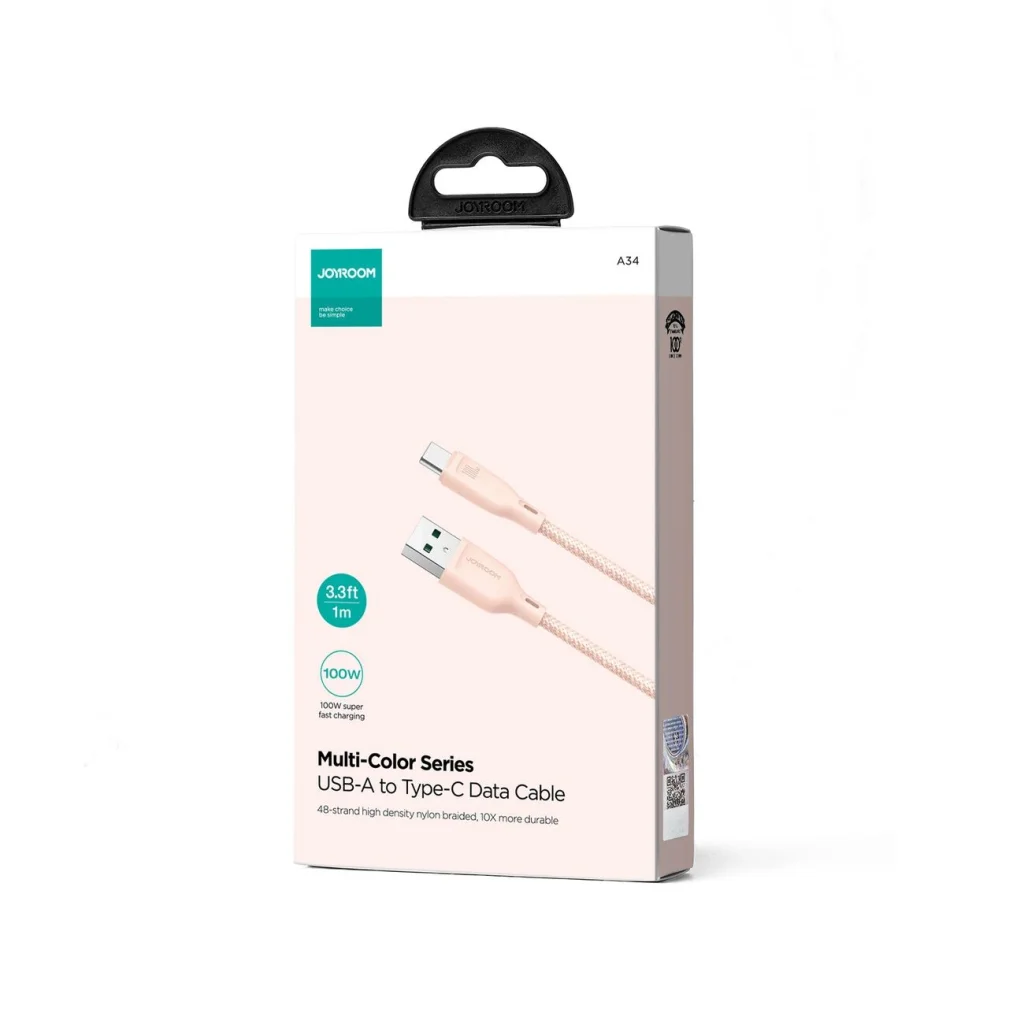 Joyroom Multi-Color Series SA34-AC6 USB-A / USB-C kábel 100W gyorstöltéssel 1m - Rózsaszín A Joyroom Multi-Color Series SA34-AC6 kábel garantálja a gyors töltést, kivételes tartósságot és megbízhatóságot. Nemcsak tölt, hanem hihetetlen, 480 Mbps sebességgel továbbítja is az adatokat. Nagy fájlokat most másodpercek alatt átküldhetsz. Nem kell aggódnod a gyakori cserék miatt - a Joyroom Multi-Color Series több mint 10 000 hajlítást is kibír. Kopásálló és nagyon tartós. Ez egy olyan kábel, amire számíthatsz. Válaszd ezt, és ismerd meg a páratlan minőséget. A Joyroom Multi-Color Series SA34-AC6 kábel legfontosabb előnyei:- Azonnali töltést és adat szinkronizálást tesz lehetővé. Támogatja a 480 Mbps fájlátviteli sebességet. Most nagy fájlokat küldhetsz át másodpercek alatt, értékes időt megtakarítva.