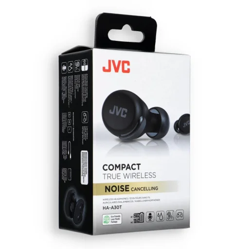 A JVC HA-A30T a True Wireless Stereo (TWS) fülbe helyezhető fejhallgató kategóriába tartozik, Bluetooth 5.2 technológiával, mely akár 7,5 órás lejátszási időt biztosít egyetlen töltéssel és akár 21 órát a töltőtokkal. A fülbe helyezhető kialakítás stabil illeszkedést és hatékony zajszigetelést biztosít a környezeti zaj ellen. Ezek a könnyű és ergonomikus fejhallgatók mindennapi használatra és fizikai tevékenységekhez is alkalmasak. A Bluetooth 5.2 kapcsolat stabil kapcsolatot garantál, akár 10 méteres hatótávolsággal. A modell támogatja az A2DP, AAC, AVRCP, HFP és SBC profilokat, így kiváló minőségű hangátvitelt és kényelmes hívásokat biztosít. A neodímium mágnes meghajtók 20-20 000 Hz-es frekvenciaátvitelt és 16 Ω-os impedanciát kínálnak, tiszta és kiegyensúlyozott hangzást biztosítva. Az érintésvezérlés lehetővé teszi a hangerő szabályozását, hívások kezelését és a lejátszás irányítását, anélkül, hogy a telefonhoz kellene nyúlni. A fejhallgató egyetlen töltéssel akár 7,5 órát bír, és a töltőtokkal akár 21 órát használható. A fejhallgató töltési ideje körülbelül 2 óra, a toké körülbelül 2,5 óra. A gyorstöltési funkció 10 perc töltés után további üzemidőt biztosít. Az IPX4 minősítésű kialakítás fröccsenésállóságot nyújt. A beépített mikrofon lehetővé teszi a hívások lebonyolítását és a mikrofon némítását.