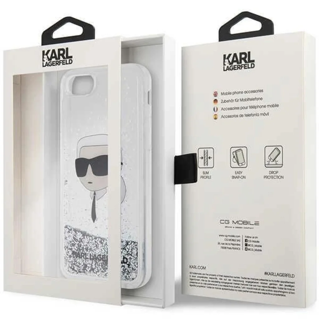 A Karl Lagerfeld Liquid Glitter Karl's Head egy védőtokok kollekció, amelyet a világhírű divattervező, Karl Lagerfeld fejlesztett ki. A tokot folyékony csillámpor részecskék különböztetik meg, amelyek a fényben csillognak és a dőlési szög változásával megváltoztatják elhelyezkedésüket. A klasszikus átlátszó tok, a vizuális hatásokon túl, az excentrikus tervező képmásával is díszített. A tok kiváló minőségű, tartós, kopásálló műanyagból készült. A hátoldal erős és kemény polikarbonátból, az oldalak pedig rugalmas TPU szilikonból állnak.
