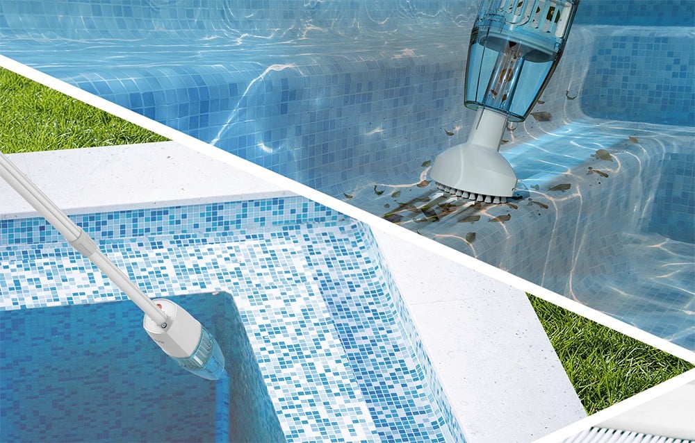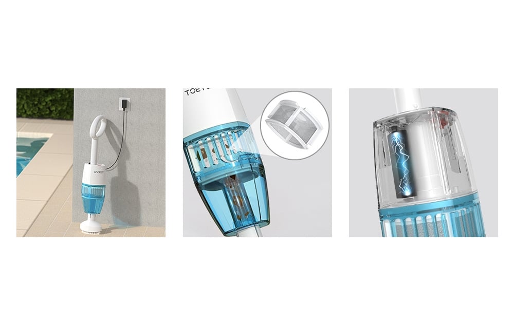 Teleszkópos alumínium rúd: A porszívó teleszkópos alumíniumrúddal van felszerelve, amely akár 1,5 méterre is kinyúlik, így könnyen hozzáférhet a nehezen elérhető területekhez, mint a lépcsők, sarkok vagy medencefalak.