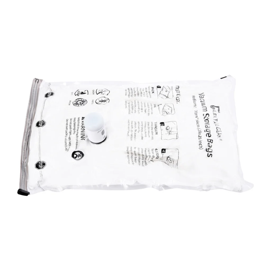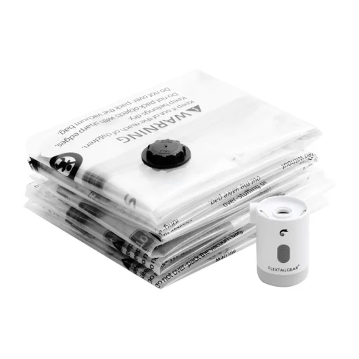 A Flextail S vákuumzsákok eltávolítják a levegőt a lezárt zsák belsejéből, akár 80%-kal csökkentve a ruhák vagy textíliák térfogatát, megkönnyítve a bőröndbe való csomagolást és az otthoni hosszú távú tárolást. A 40 × 60 cm-es méretű zsákba körülbelül 6-8 pulóver vagy hasonló mennyiségű puha ruha fér el, így kompakt, stabil csomagot képez, amely jelentősen kevesebb helyet foglal. A szelep kialakítása a Flextail szivattyúkkal, mint például a Tiny Pump 2X vagy a Max Pump 3 szivattyúkkal működik, amelyek gyorsabb tömörítést és tartósabb vákuumhatást biztosítanak, mint a kézi módszerek. A légmentes anyag védi a tartalmát a nedvességtől, portól és szagoktól, az átlátszó forma pedig lehetővé teszi, hogy a csomagot kinyitása nélkül is könnyen azonosíthassa a tartalmát. A készlet négy zsákot tartalmaz.
