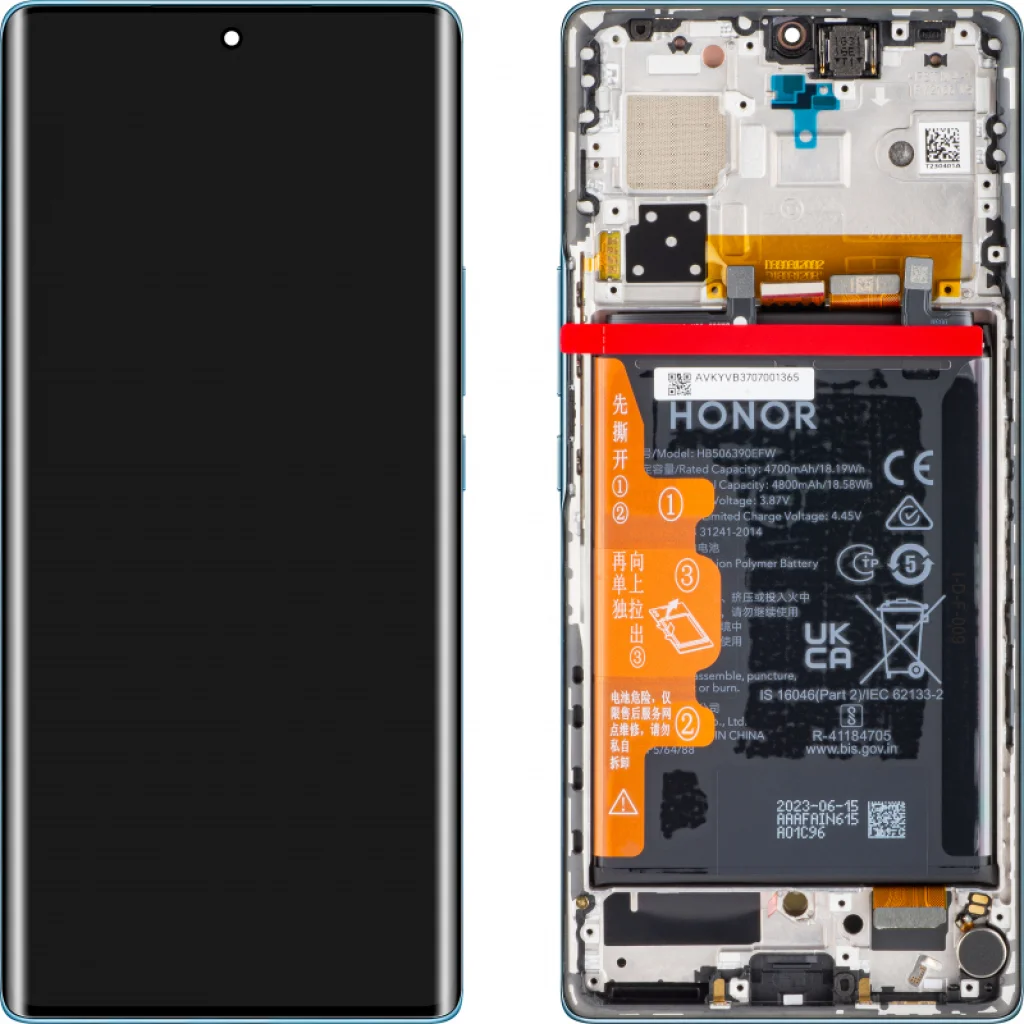 LCD Kijelzőmodul Honor 70 - Izlandi Fagy. Eredeti csereszerviz alkatrész az Honor 70-hez. Az LCD kijelzőmodul eredeti, és pontosan megegyezik azzal, ami a telefonnal érkezett. Használja az új LCD-t, ha az eredeti repedt, karcos, vagy más módon rongálódott, akár leesés, akár idővel történő kopás miatt. Tartalmazza a hangszórót, kijelző keretet, akkumulátort, rezgőmotort, oldalsó gombokat.