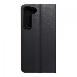 Elegáns tok fém kerettel a telefon fokozott védelme érdekében. A vonzó textúra és a kellemes tapintású anyag olyan stílusos tokká teszi, amely kiemeli a készülék modern dizájnját. A puha velúr anyag belül és a tartórészben biztosítja, hogy a készülék mindkét oldala védett legyen a sérülésektől és karcolásoktól. A tartó rugalmas szilikonból készült, és kivágásokkal rendelkezik. Az alumínium keret az éleken megerősíti a tokot, és tovább védi a készüléket. A fém és az eredeti anyag kombinációja egyedi és modern kompozíciót hoz létre, amelynek köszönhetően a készülék stílusos és elegáns megjelenést kap. A tok egy kis zsebbel is rendelkezik kéznél lévő dokumentumok vagy bankjegyek számára. A tok vízszintes talpként is használható filmek vagy fényképek megtekintéséhez. Az erős mágnes könnyű nyitást és zárást biztosít, megakadályozva a tok véletlen kinyílását.