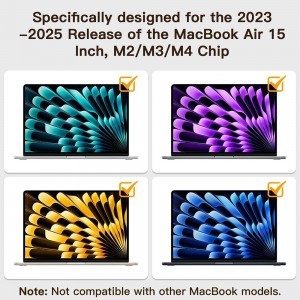Ez a kijelzővédő fólia kifejezetten a 2023 és 2025 között megjelent 15 hüvelykes MacBook Air modellekhez (M2, M3, M4 chippel szerelt) készült. A precíz kivágások tökéletes illeszkedést biztosítanak a kijelzőhöz, beleértve a kamera körüli területet is. Fontos megjegyzés: Nem kompatibilis más MacBook modellekkel.