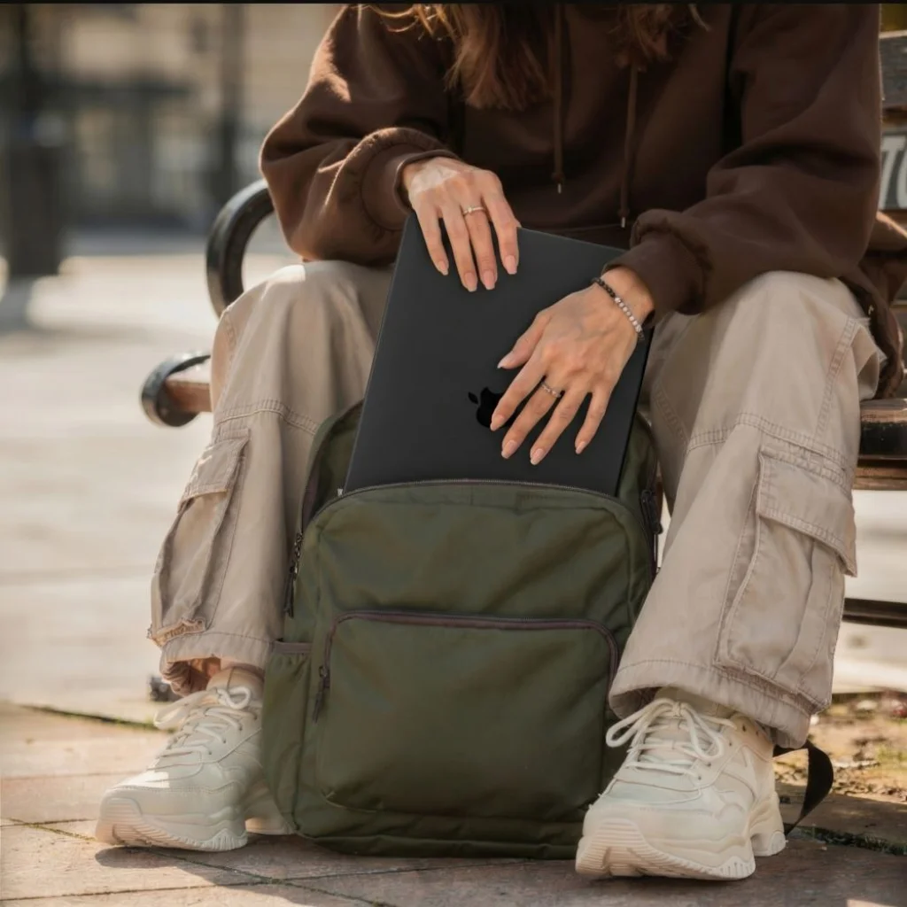 A tok két pontosan illeszkedő részből áll – egy felső fedélből és egy alsó részből –, amelyek precízen körülölelik a MacBook burkolatát, és védelmet nyújtanak a karcolásokkal, porral és kisebb ütődésekkel szemben a mindennapi használat során. Az alsó részen található gumilábak stabil elhelyezést biztosítanak az asztalon, és megóvják az alsó burkolatot a karcolódástól.