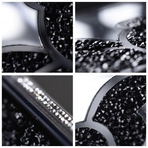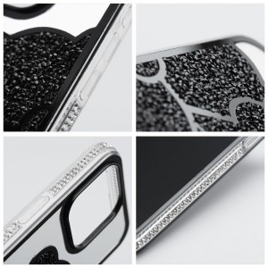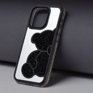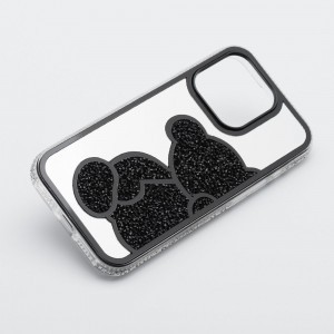 A tok központi eleme a jellegzetes, csillogó fekete kristályokkal kirakott maci minta, amely egy fényes, tükörhatású felületen érvényesül. Ezek az apró, gondosan elhelyezett strasszkövek egyedi csillogást és luxus érzetet biztosítanak, kiemelve a tok egyediségét.