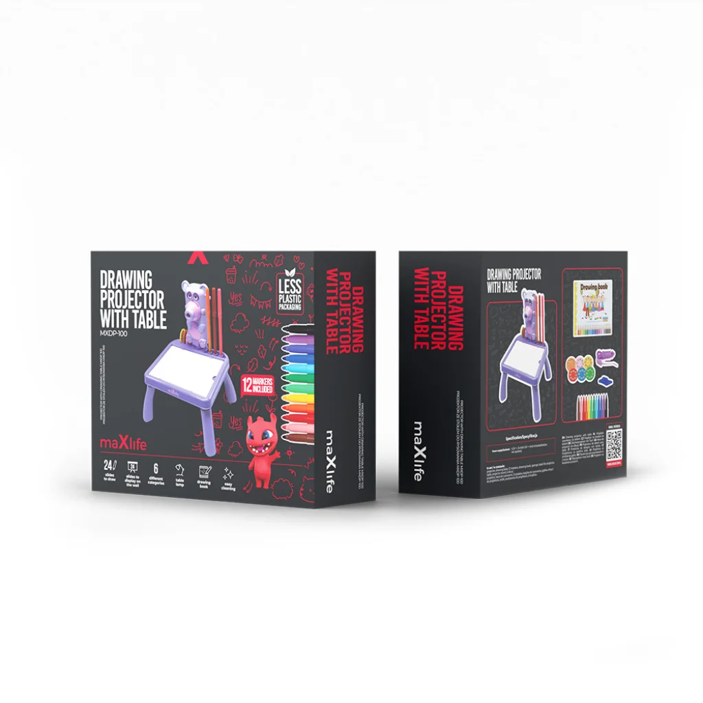 A Maxlife Rajzasztal Projektor MXDP-100 egy multifunkcionális játék, amely egyesíti a tanulást és a játékot. A képek készítése a projektorral javítja a gyermek kézügyességét, és segít fejleszteni a precizitást és pontosságot, melyek szükségesek a minták és írás jövőbeli elsajátításához. A projektor kinézete és funkcionalitása minden gyermeket magával ragad, hosszú távú szórakozást és fejlődést biztosítva.