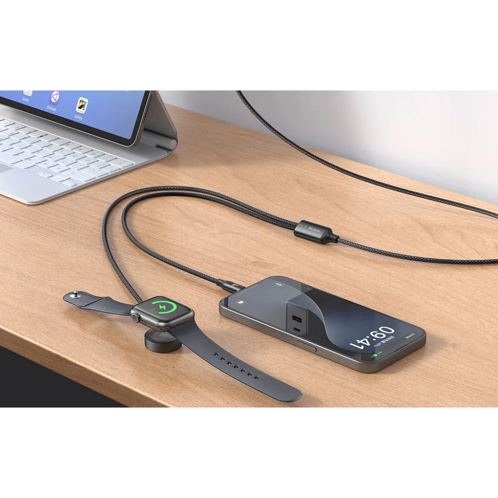 A Mcdodo CA-2200 egy innovatív 2 az 1-ben kábel, amely a gyors töltést egyesíti USB-C porton keresztül az Apple Watch vezeték nélküli töltőjével. Ezzel a megoldással egyszerre töltheted mobilkészülékeidet és órádat, így ideális választás azoknak, akik a funkcionalitást és a kényelmet értékelik.