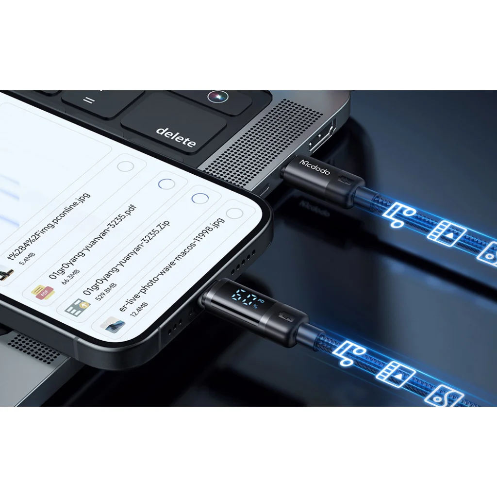 A Mcdodo CA-5780 segítségével nemcsak töltheti eszközeit, hanem akár 480 Mbps sebességű adatátvitelre is képes. Ez a funkció lehetővé teszi a fájlok kényelmes másolását az eszközök között további kábelek nélkül, így ideális munkához és mindennapi használatra.