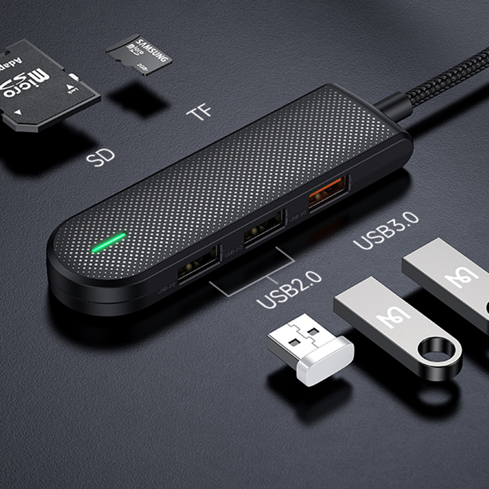 Mcdodo Hub Star Series (HU-1430) 5in1, 2x USB2.0, USB3.0, SD/TF kártyahely, 5Gbps, ABS+Nylon, Type-C kábel, 15cm - Fekete
