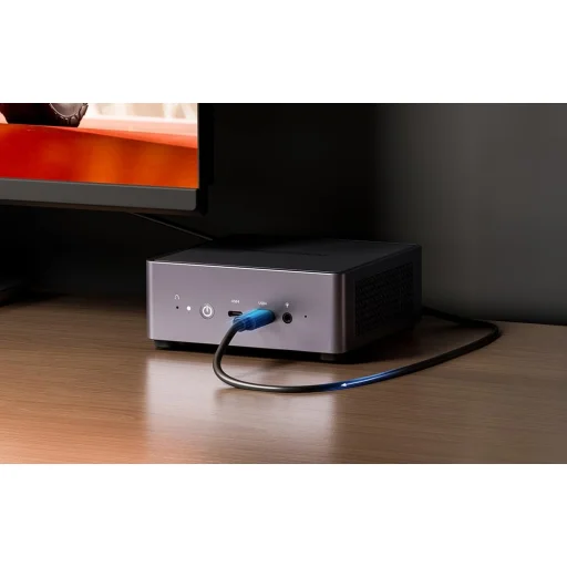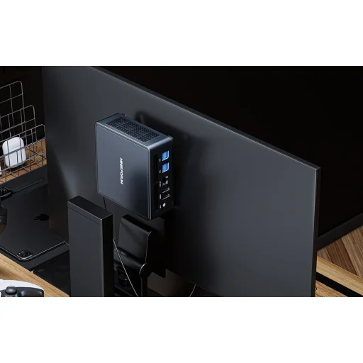 A Minisforum UM790 Pro nemcsak belső értékeivel, hanem külső megjelenésével és praktikumával is lenyűgöző. Rendkívül kompakt méretének köszönhetően minimális helyet foglal el az asztalon. Ráadásul a mellékelt VESA tartóval könnyedén rögzíthető monitorod hátuljára, így teljesen eltüntethető a szem elől, maximalizálva az íróasztalod hasznos felületét.
