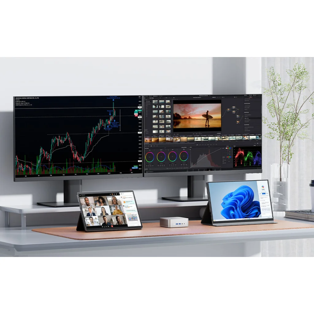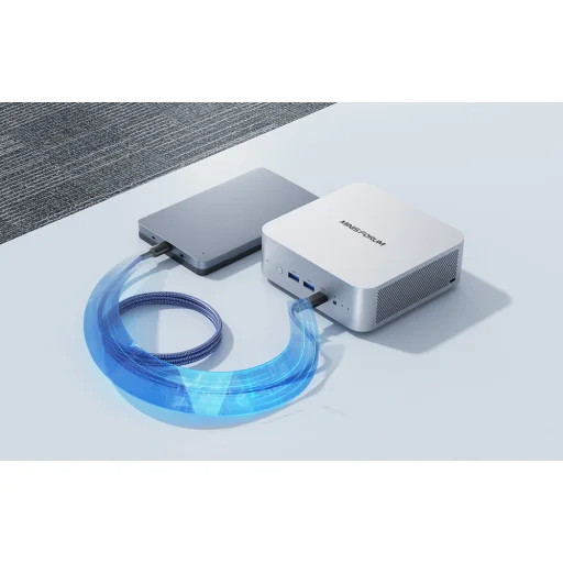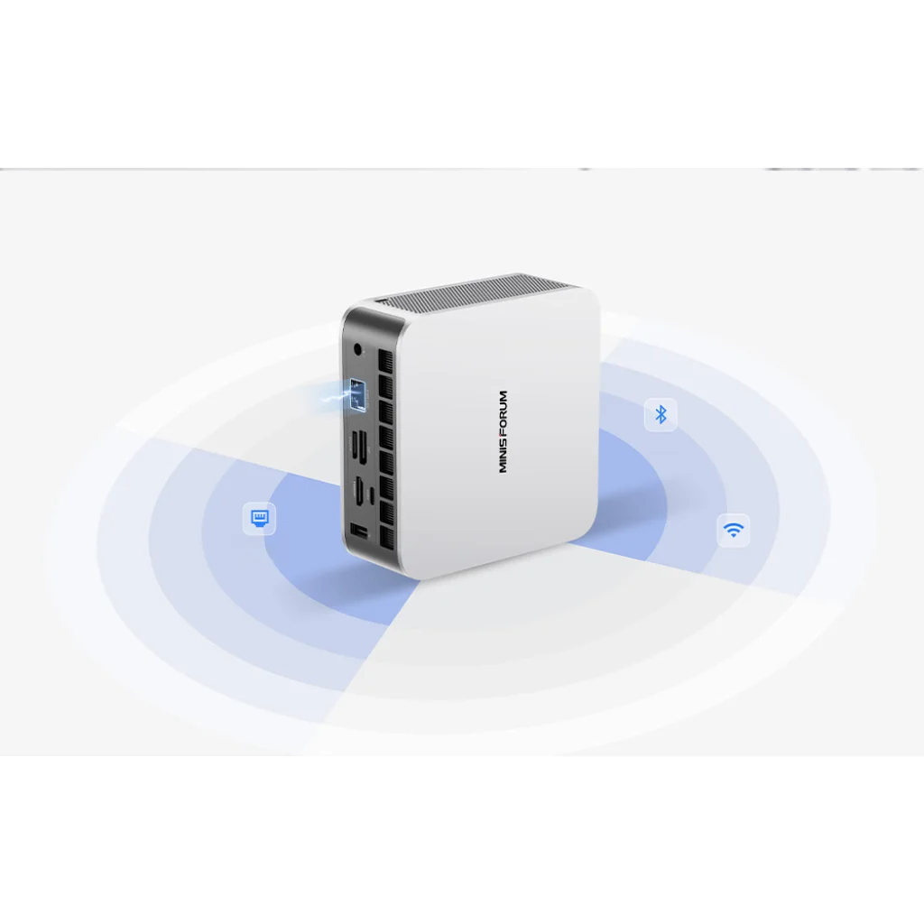 A MiniPC portok széles választékát kínálja, többek között USB4, HDMI 2.1 FRL, DisplayPort, OCuLink, valamint 2,5G LAN-csatlakozót. Ez megkönnyíti a 4K/8K monitor, nagy sebességű külső meghajtó vagy egyéb kiegészítők csatlakoztatását. A számítógép támogatja a Wi-Fi 7 és a Bluetooth 5.4 szabványt is a stabil vezeték nélküli kapcsolat érdekében.
