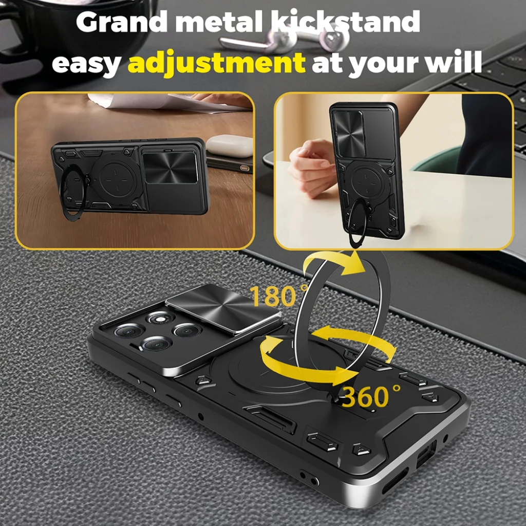 A tok hátulján található robusztus fém kitámasztó gyűrű rendkívül sokoldalú. A 180 és 360 fokos elforgatási lehetőséggel könnyedén beállíthatja a telefonját az ideális nézési szögbe videózáshoz, videóhívásokhoz vagy böngészéshez, akár fekvő, akár álló módban. Emellett ujjgyűrűként is funkcionál, stabilabb fogást biztosítva, és megakadályozva az esetleges leejtéseket.