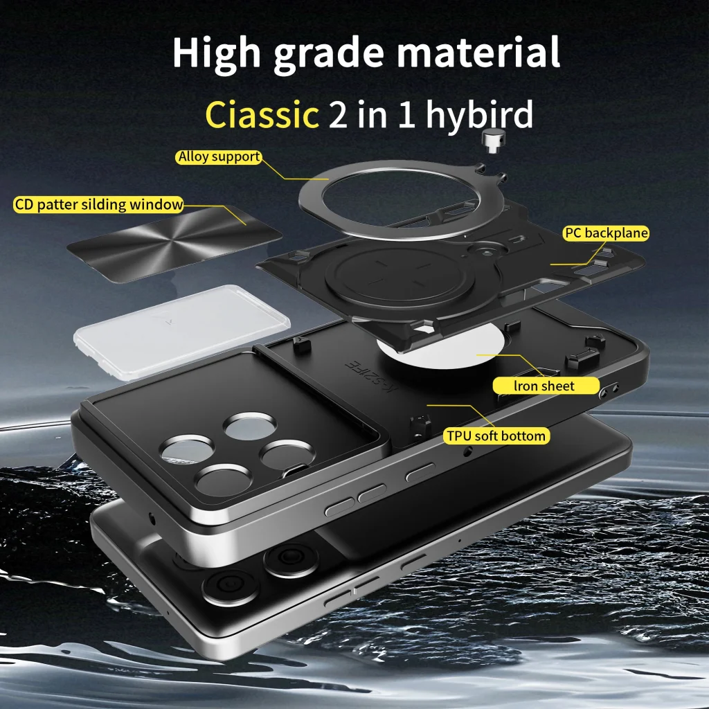 Ez a tok egy "2 az 1-ben hibrid" szerkezet, amely magas minőségű anyagok kombinációjából készült a maximális védelem érdekében. A tartós TPU puha alsó rész elnyeli az ütéseket, míg az erős PC hátlap és az ötvözött fém merevítés további ellenállást biztosít. A beépített vaslemez garantálja a mágneses rögzítés stabilitását, miközben az egész szerkezet tartós és megbízható védelmet nyújt.